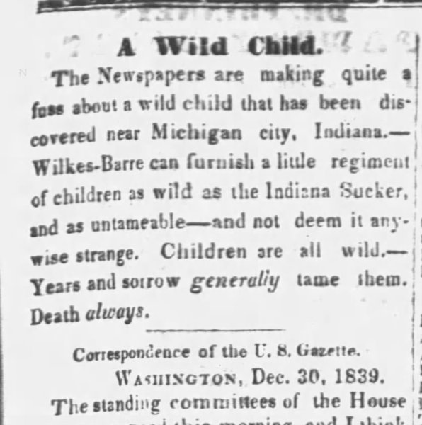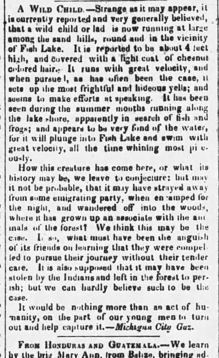 2. Though carried in many newspapers, this article from The Buffalo (NY) Commercial published on December 16, 1839. After a month of these reports, The Wilkes-Barre (PA) Advocate published it's viewpoint on the whole problem on January 8, 1840. This story is recounted in The Bigfoot Casebook by Janet and Colin Bord. It sounds familiar to me; if you find I've double-posted, please let me know.