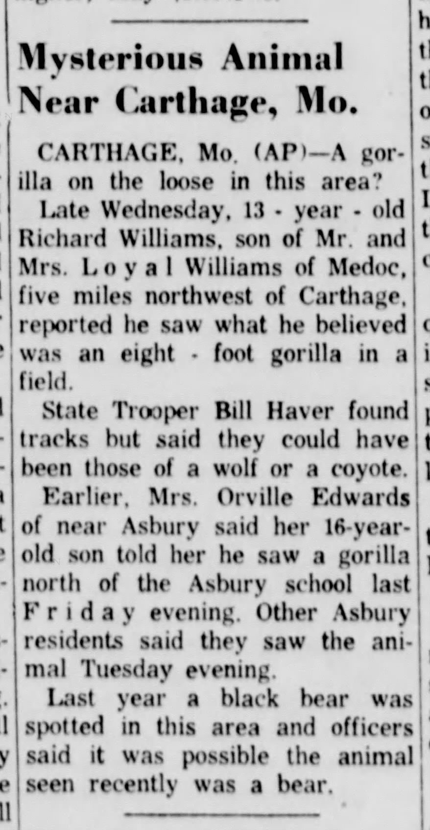 23. A monkey or a juvenile Bigfoot? This story is from the Monroe (LA) Morning World on December 06, 1942.