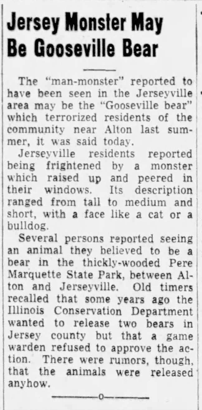 The Gooseville monster died with a whimper - in the news that is. After about August 15, 1949, scarce a word of the monster could be found. However, on October 3, 1949, the Belleville (IL) Daily Advocate theorized that the Gooseville monster may have relocated to Jerseyville, Illinois. -