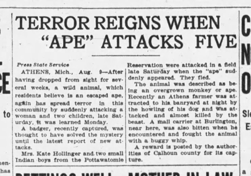 Michigan 1926 - Escaped Ape Near Athens - Tirademan?