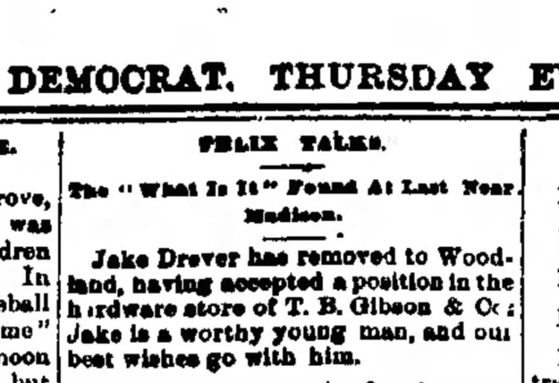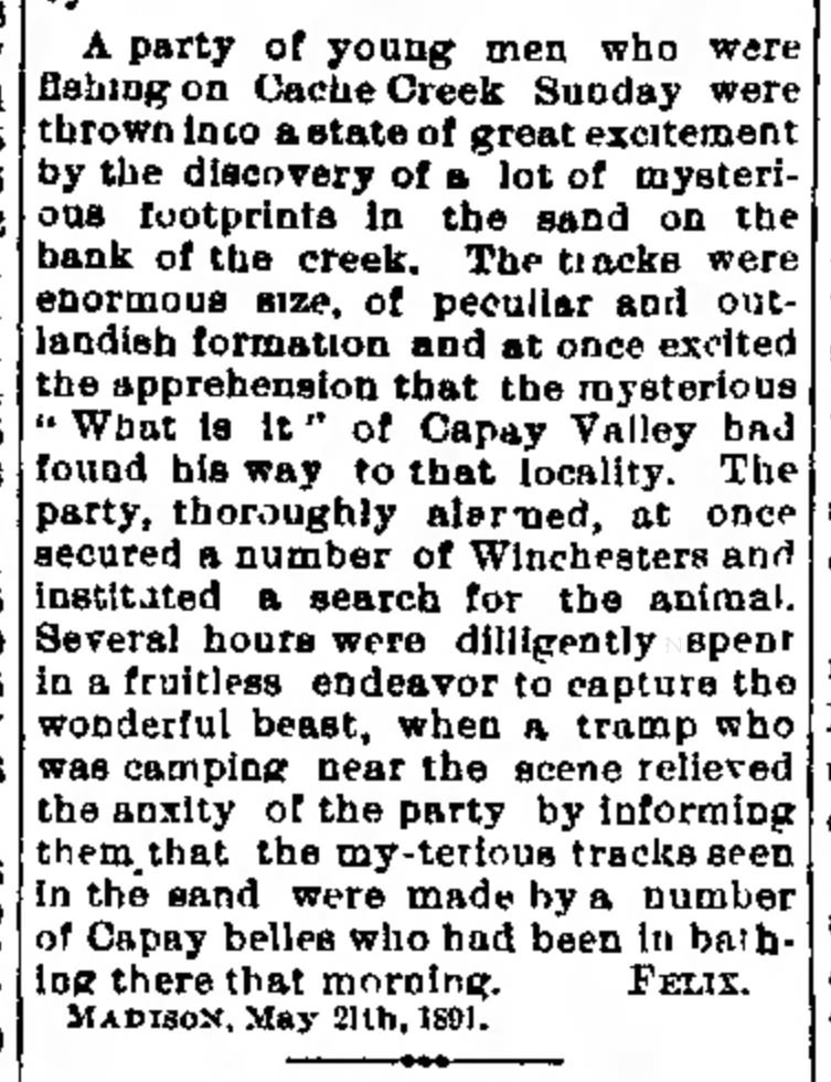 Published in the Woodland (CA) Daily Democrat on May 21, 1891. When I find one article about an old encounter, I like to see if I can find others. I'm not sure that attributing huge tracks to the young ladies of Capay bathing explains this find. - Today