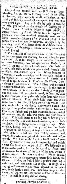 This is a good full account, published in The Caledonian (Edinburgh, Scotland) Mercury on April 07, 1800. It does sound like a feral child, although interesting questions are raised. - Today