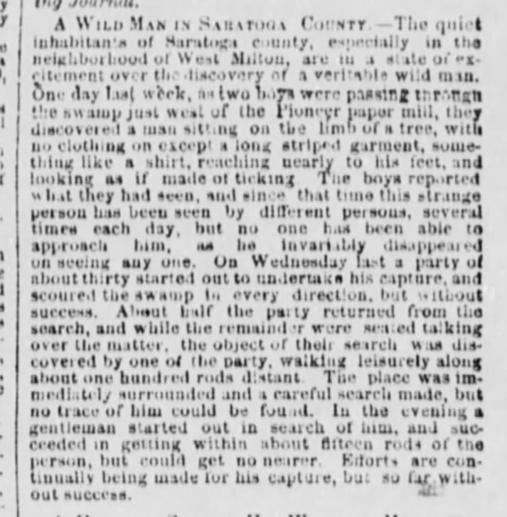 And now for the rest of the story. This story is included in Bigfoot in New York and New England by Paul and Robert Bartholomew, however - they fail to mention some important particulars. This may be an innocent oversight, as I rarely find the exact newspaper clipping cited by someone else and many wild man stories are borrowed and truncated by other papers. This report from The Buffalo (NY) Daily Republic on June 1, 1868, provides details that make the wild man sound more like a man than beast. -