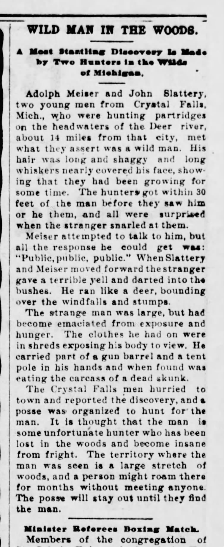 Michigan 1902 as reported in The Yakima Herald on February 18, 1902. Sadly, this sounds like a human with mental health issues who probably died in the woods. -