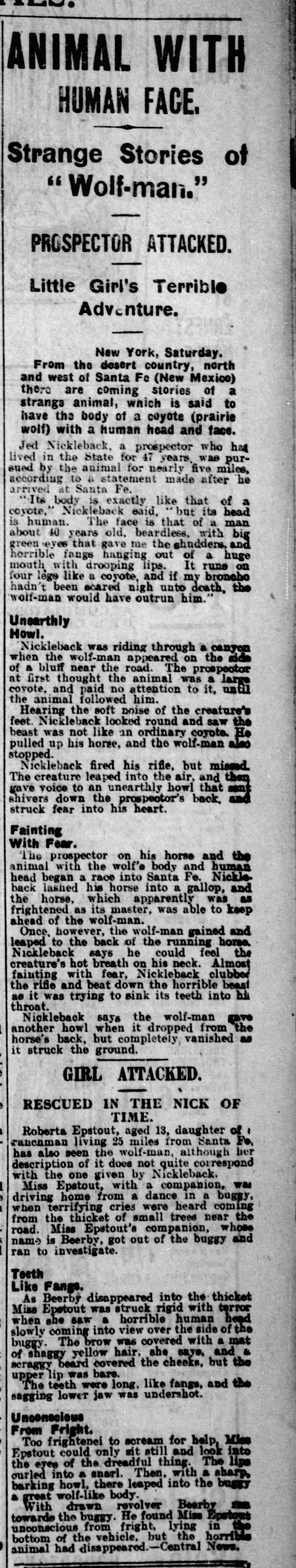 2. Classic line - "If my bronco hadn't been scared nigh unto death, the wolf-man would have outrun him. While the prospector definitively described something canine (and on 4 legs), the girl's story is more ambiguous. Published, of all places, in the Birmingham (England) Evening Despatch on February 16, 1924. And yes, it is spelled "Despatch."