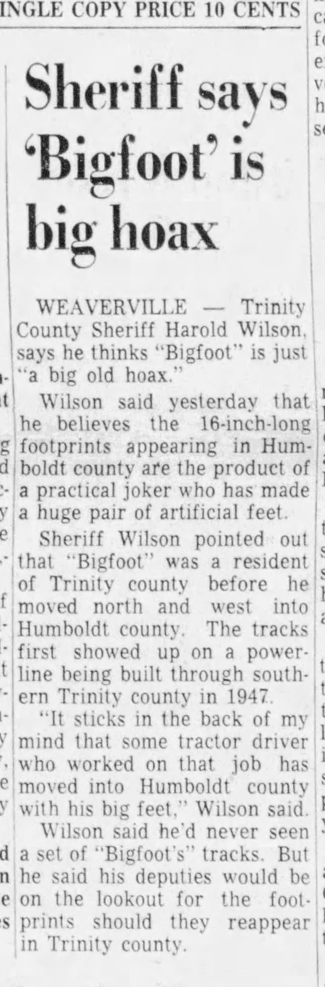 24. Published in The Times Standard of Eureka, California, on October 14, 1958. More contemporaneous, and contradictory, statements from Ray Wallace about whether he was the one hoaxing Bigfoot tracks on a Bluff Creek road construction project.