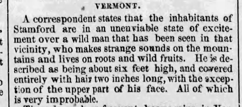Published in The Springfield (MA) Daily Republican on July 25, 1861, included in Bigfoot in New York and New England by Paul and Robert Bartholomew, and likely found by Tirademan, this Vermont sighting is close enough to western Massachusetts to be part of the North Adams (MA) wild man scare that was explained away as a student in "gorilla guise" at https://bigfootforums.com/topic/122216-massachusetts-1861-wild-man-was-just-a-student-tirademan/. The Springfield (MA) Daily Republican, August 10, 1861 - a month later and they're still hearing the wild man. - Today