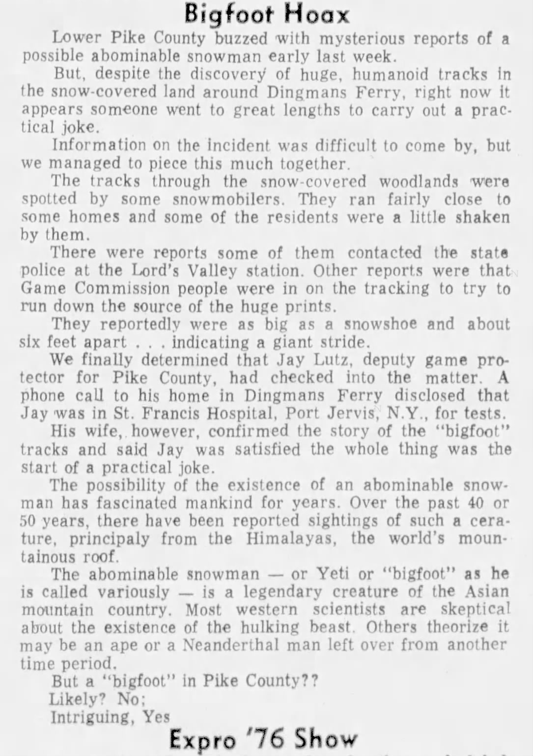 Published in The Times-Tribune of Scranton (PA) on January 25, 1976. I might go for mistaken identity (deer bellying out in deep snow, which has been shown somewhere on the Forums), but a hoax? -