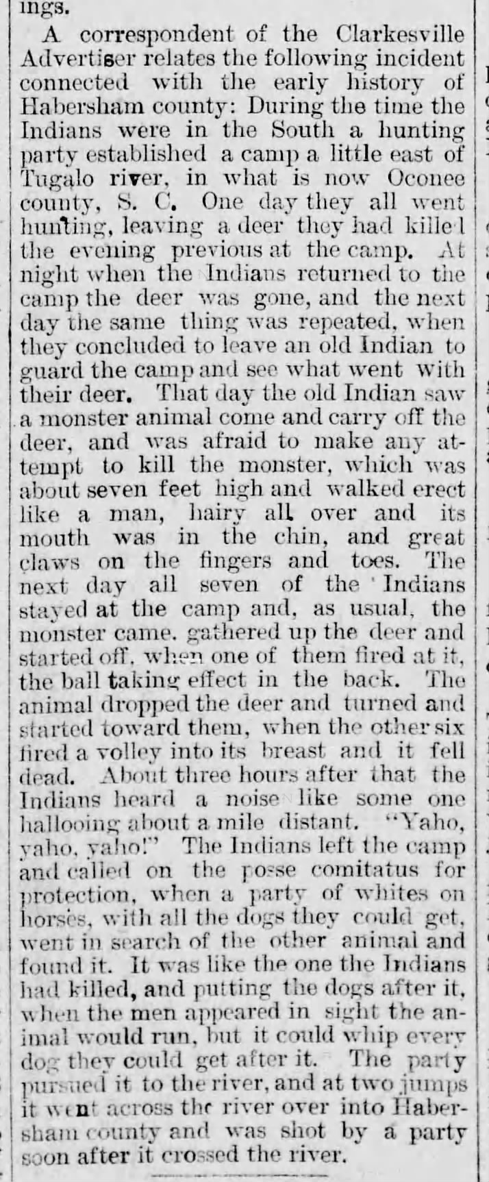 This article published in The Macon (GA) Telegraph on May 31, 1889, appears to be the earliest version of this story. This specific version appeared in a column labelled "Round About In Georgia" and recounts two separate incidents that occurred in "the early history" of Habersham County, Georgia. However, the first incident appears to have occurred in Oconee County, South Carolina. - Today