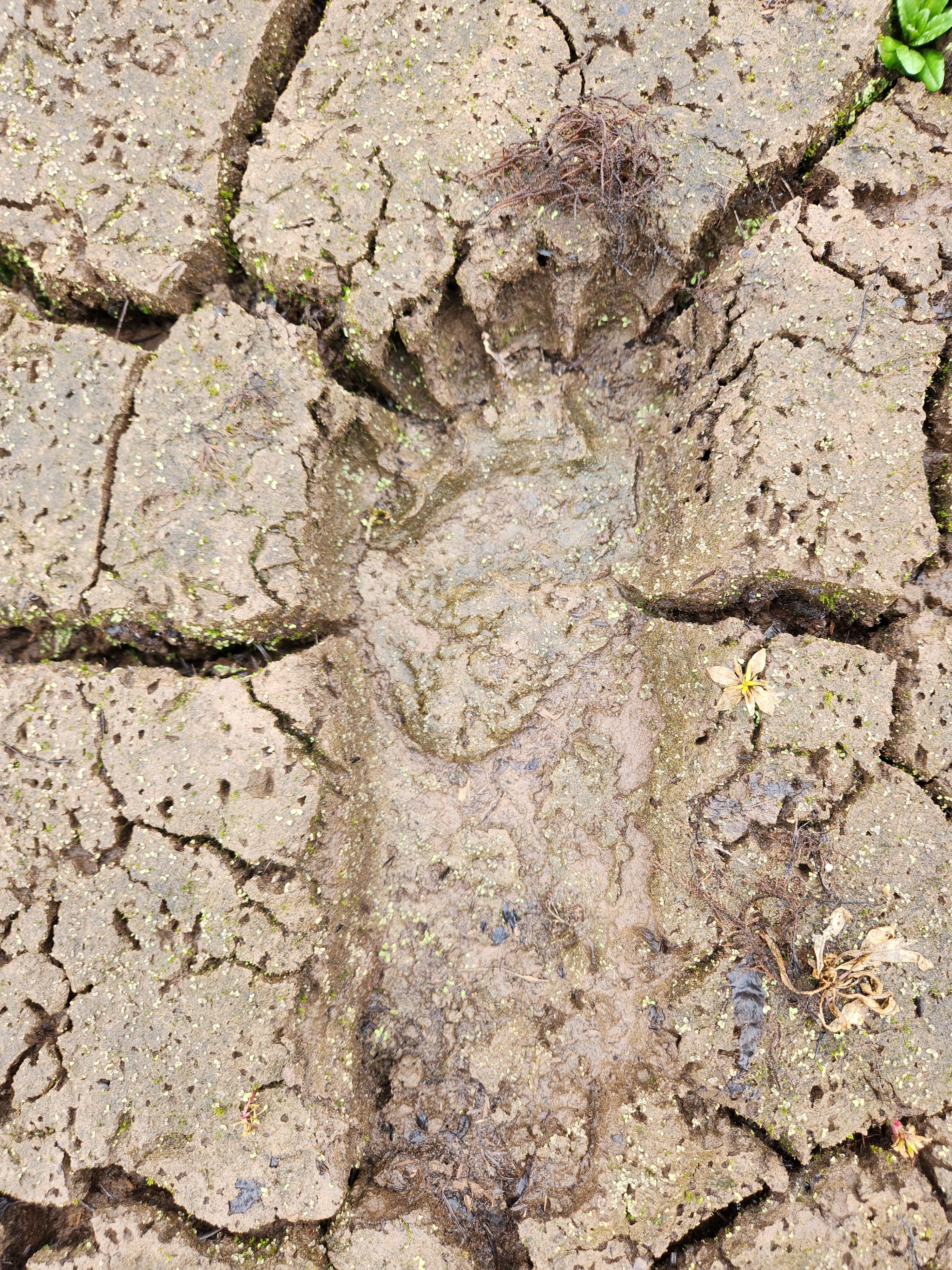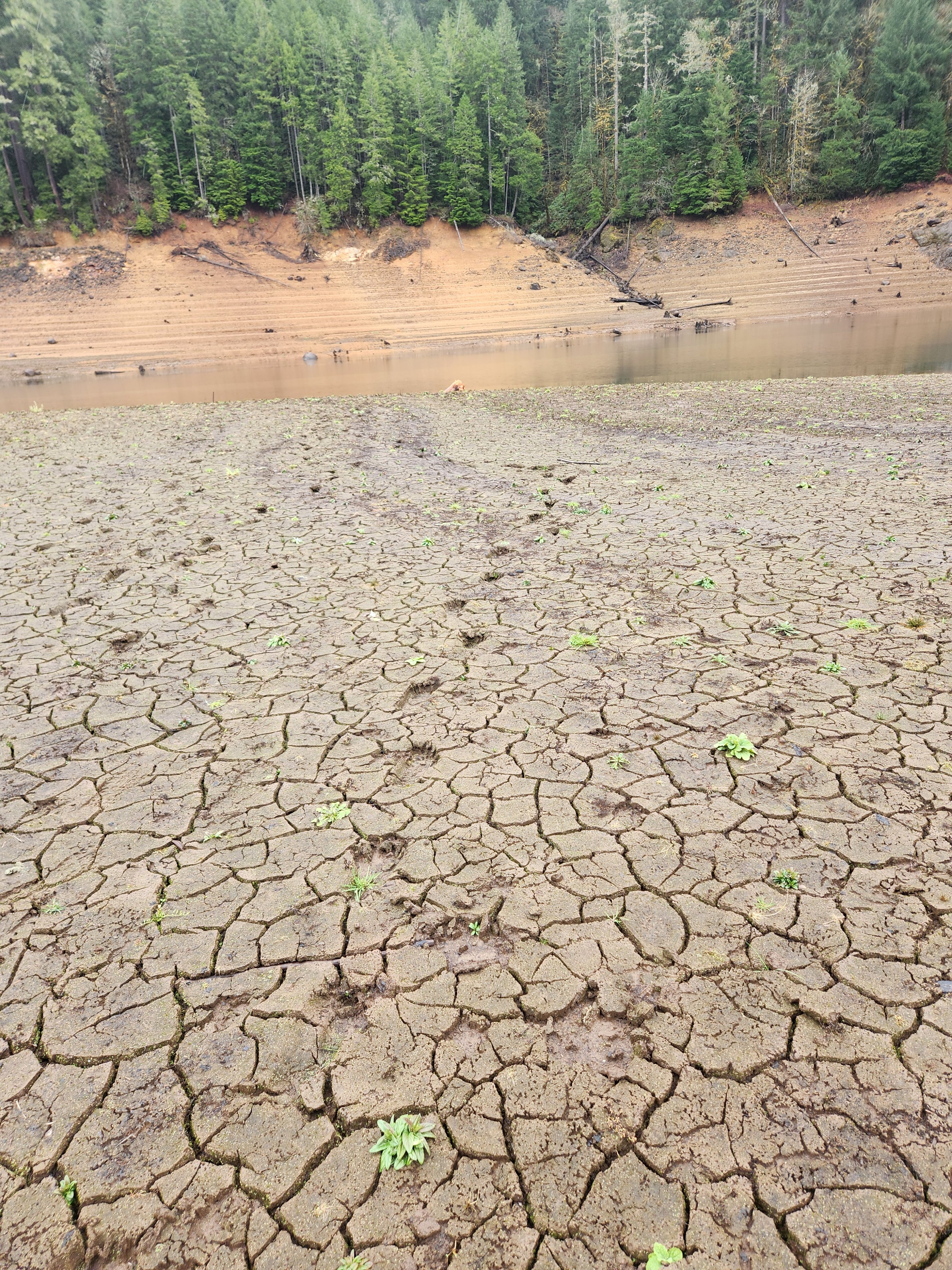 Date & Time - February 14, 2026. Daytime. Weather - 40, drizzly rain, overcast Location- a river leading in to a reservoir in Oregon, the mudflats What Happened - I took a drive to visit the reservoir to look at the prints that I found last week, but mostly to follow that trail. Turns out, that was nothing, just a 100 yard pathway down to the day use area that I had pulled into, and where I first saw the prints. No knocking this time. In addition, it had been drizzling and raining nearly continuously for the week, and the water had risen 5 feet (a staggering volume of water) and covered up all the prints. If I had visited that area yesterday, I would have had no idea that anything special had recently happened. I guess that's something to keep in mind. But, it was a nice rainy day, where the forest smells fresh, the clouds cling to the trees and everything sounds slightly muffled, so I wasn't bummed for long. I turned on my seat heaters, rolled down the windows and continued driving. About 10 miles down the road, I saw a mud flat, and turned out to see it better through the trees. I could see all sorts of disturbances in the mud, but I was a long way up, and everything was indistinct. I picked up my chest rig, my rain jacket and went to explore. Turns out, the side was so steep, I had to go down partially sliding on my butt. I didn't let that stop me. The mud flat smelled musty and fusty, and unfirtunately, everything I saw at first was deer prints. I walked out towards the river towards the last bit of disturbed ground and hit pay dirt. AGAIN. 9-inch, very deep prints, only a few days old. They made a big circle 8, and a loop. Weird thing, I could not find where the began or ended. Just this group of 50 prints milling about on the mud flats. Huh. That's when I discovered I had left the plaster in the truck. I wanted to pull my hair out. I videod and photographed the trackway and thought I'd just run back to the truck, get the material and return. I almost didn't get up the side of the reservoir. It took me a half hour, and I had to crawl on my hands and knees. No way was I going back down there. That was very difficult, and neither my knee nor wrist are 100% any longer. So, I didn't get to cast them. I'm hoping to return soon, with friends and rope, and try again.