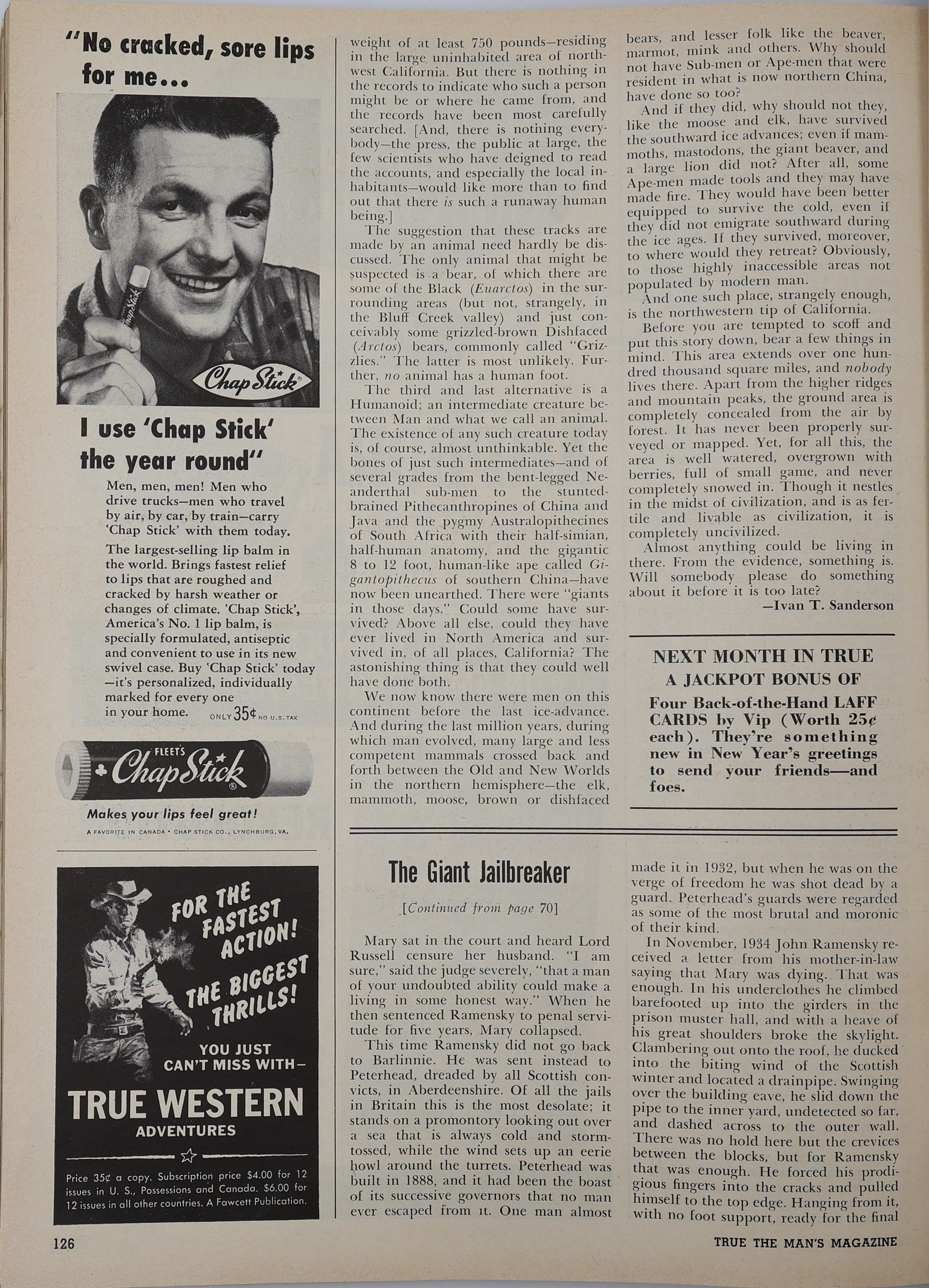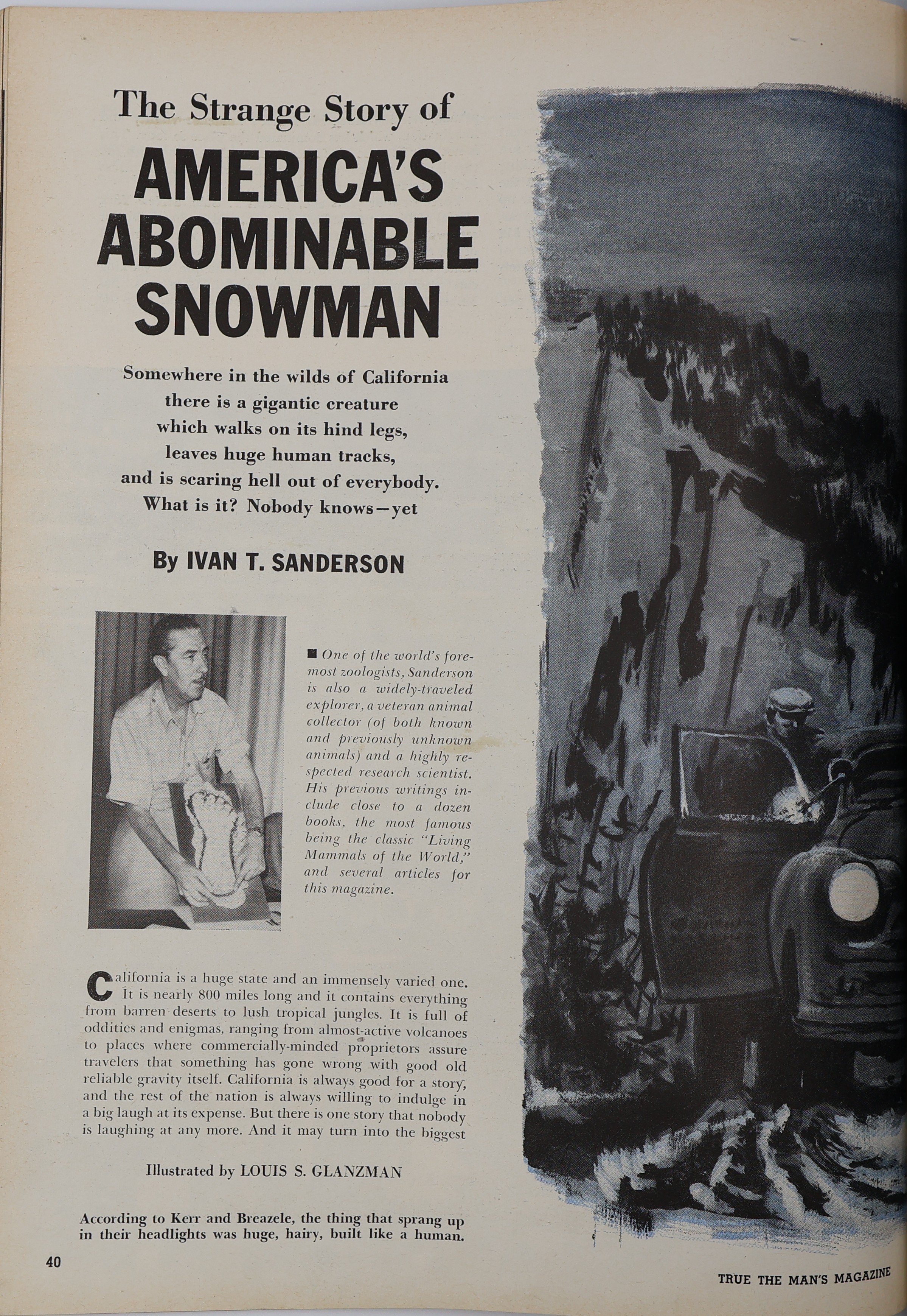 I only know of two he wrote for True, "The Strange Story of America's Abominable Snowman" for the December 1959 edition, and "A New Look at America's Mystery Giant" for the March 1960 edition. There's probably others I'm forgetting, though. I found an illustration from each I believe, but it'd be nice to verify them and see if the articles featured more! From the December 1959 edition: From the March 1960 edition: -