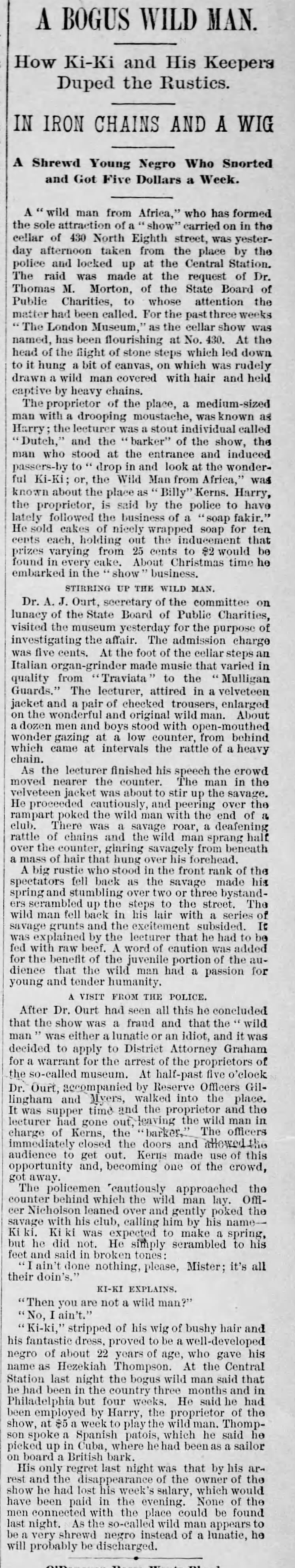 2. This story from The Philadelphia Times on January 18, 1885, is emblematic of the "wild man" who appeared in sideshows and "museums" in the 1800s.