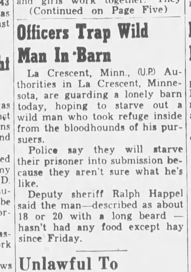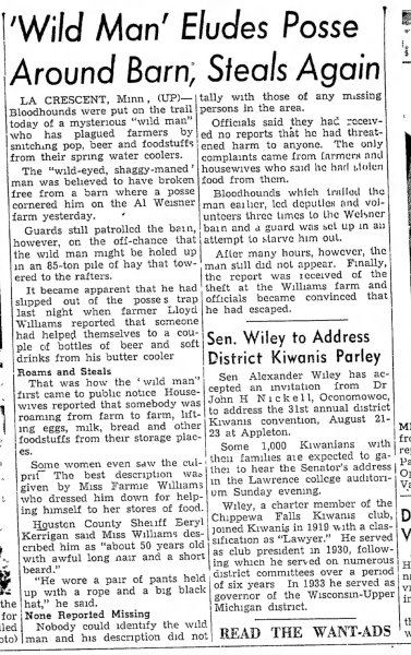 2. I tend to think that this is a human, but who knows? Published in the North Platte (NE) Telegraph-Bulletin on August 09, 1949. As published in the Waukesha (WI) Daily Freeman on August 10, 1949, he doesn't appear to have been trapped, or to have been a Bigfoot/Sasquatch.