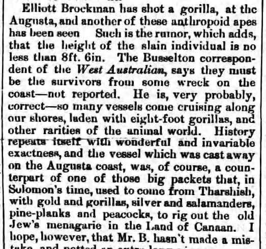 Yowie! Published in The Geraldton (Western Australia) Express on April 26, 1882. I cut one line off as it contains a vicious racial epitaph. -