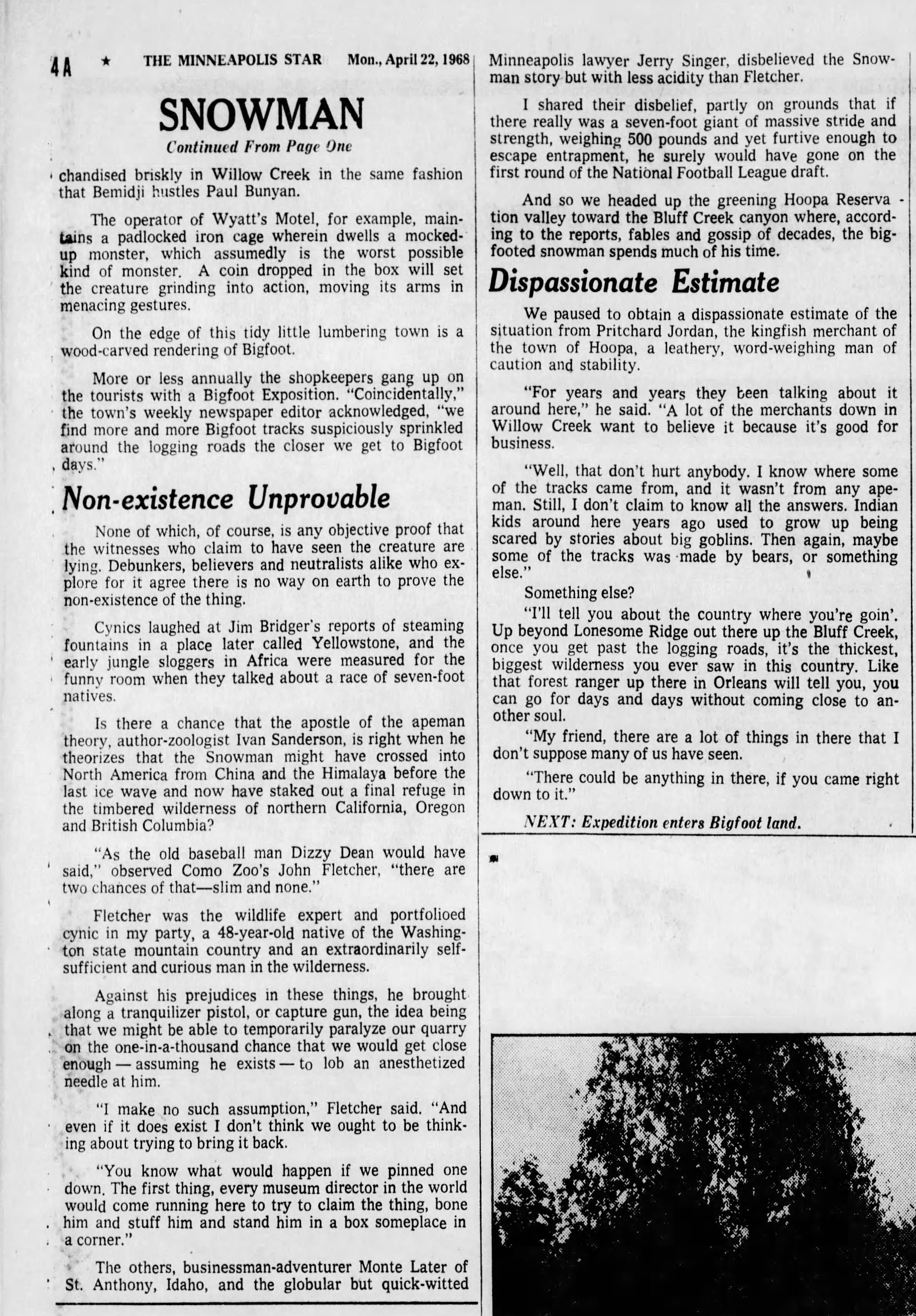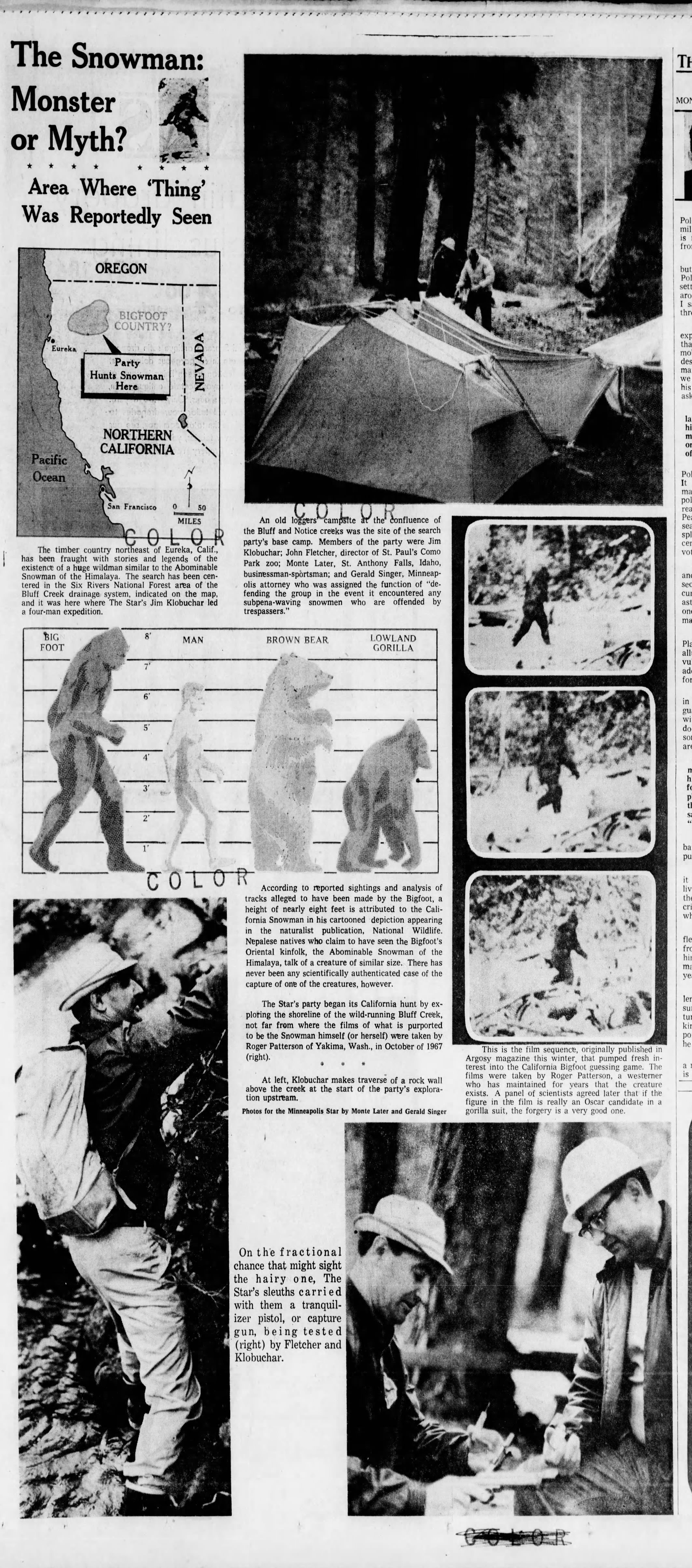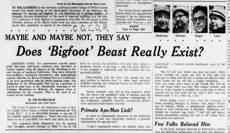 The Minneapolis (MN) Star's reporter Jim Klobuchar led an expedition to the Bluff Creek area to determine if Bigfoots really exist; his paper ran their first report on the expedition on April 22, 1968. (NOTE: I did not include the picture of Jim McClarin's statue because it was very dark and lacked detail.) -