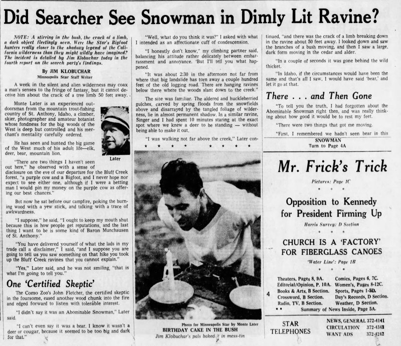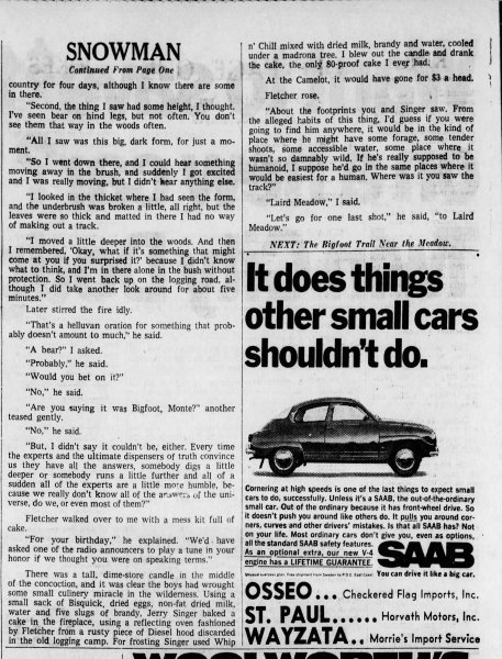 21. A kidnapping by a Sasquatch is truly a fantastic story, but none of the three stories that I've mentioned had a basis of origin in a small newspaper at all, which has now become widely believed in the story of Jocko. In the Ostman story, Ostman was a known personage who did report his story to his local newspaper (The Province) in 1957, 33 years after the kidnapping, but he had no motivation to "sell more papers". He remained alive for years after he told his story and was well interviewed, unlike the persons in the Jocko story. https://en.wikipedia.org/wiki/Albert_Ostman The Muchalat Harry story was told to Bigfoot author and investigator Peter Byrne by Father Anthony Terhaar of Mt. Angel Abbey in Oregon, who was a missionary priest who traveled the west coast of Vancouver Island for many years, and was living at Nootka at the time of the story and who knew Muchalat Harry very well. http://www.bigfootencounters.com/classics/muchalat.htm The third story has never made the newspapers. I found it posted to an Internet forum of Alaskan outdoorsmen in 2010. It has all the hallmarks of a scary campfire story, but it has some very intestine features (poop smearing) that I've never heard or read of before (but which goes quite a ways toward explaining some of the stench reports involving sasquatches), and I've come to recognize that poster from later posts, and who appears to be a pretty cogent guy. https://bigfootforums.com/topic/28150-a-coast-range-bigfoot-story/#comment-544030