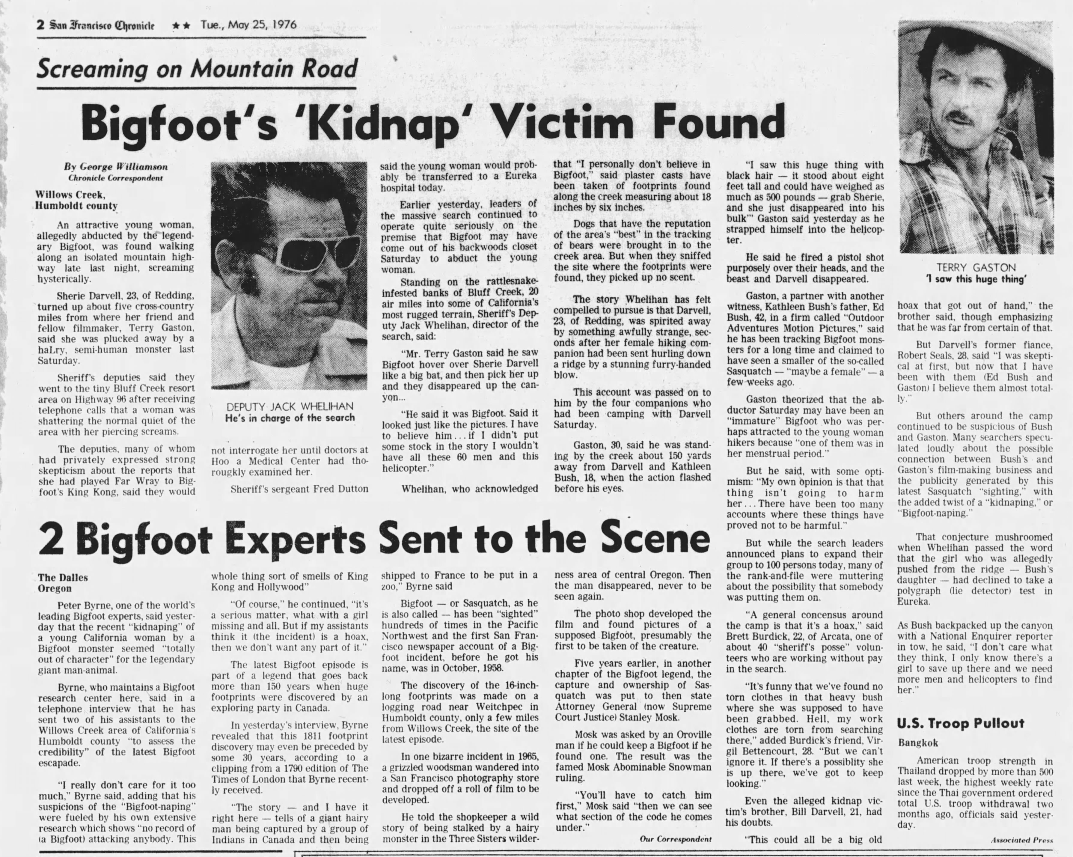 2. I find it odd that the San Francisco (CA) Chronicle has more detailed reports on some stories than local papers do. While this this incident has been covered before, this article published on May 25, 1976 provides a detailed description of the original "kidnapping" and the search efforts. It also includes a supplemental article which indicates that Peter Byrnes sent two assistants to assist in the search, and to investigate the claim. To top it all off, this article includes the only report that I've found about California's Attorney-General giving an oral advisory opinion regarding ownership of a captured Bigfoot. UPDATE: I found a 1960s clipping about the California AG's letter and was going to post it, but guess who found it first - that's right, Tirademan. He appears to have found the same AP wire story in a different paper and Gigantor archived it at https://bigfootforums.com/topic/42489-california-1960-abonimable-snow-man-in-california/.