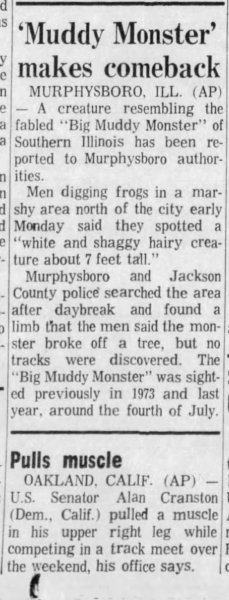Apparently the last sighting of the Big Muddy River Monster, this time published in The Des Moines (IA) Register on July 09, 1975. - Today