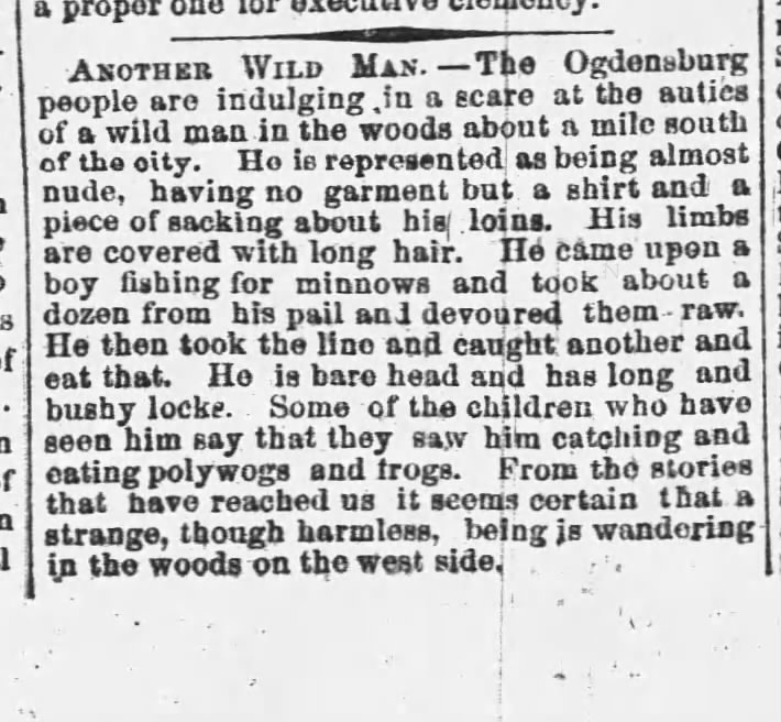 New York 1869 - And Another Wild Man, Near OgdensburgTrogluddite posted a topic in More Historical Newspaper Archives Also published in Bigfoot in New York and New England by Paul and Robert Bartholomew; this time they point out that some witnesses described a human. This article (the only one I could find) is from the Buffalo (NY) Courier on July 28, 1869.