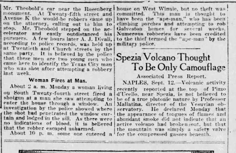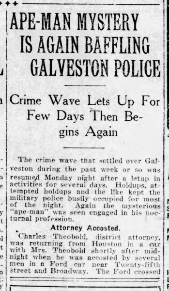 Published in The Houston (TX) Post on September 14, 1920. Bases on this story, it's unclear why the moniker "ape-man" was applied to this (presumed) human criminal. -
