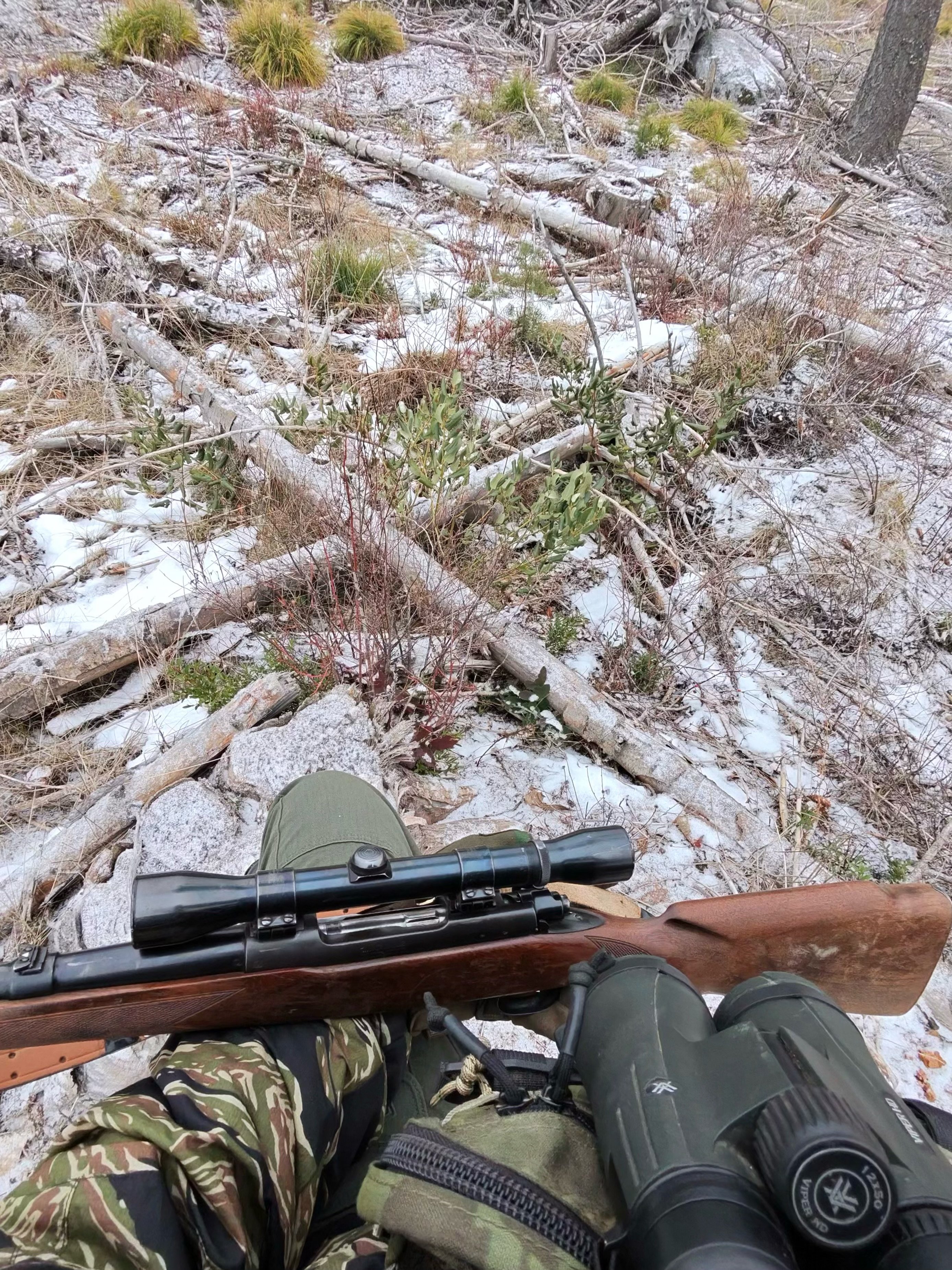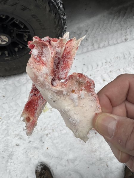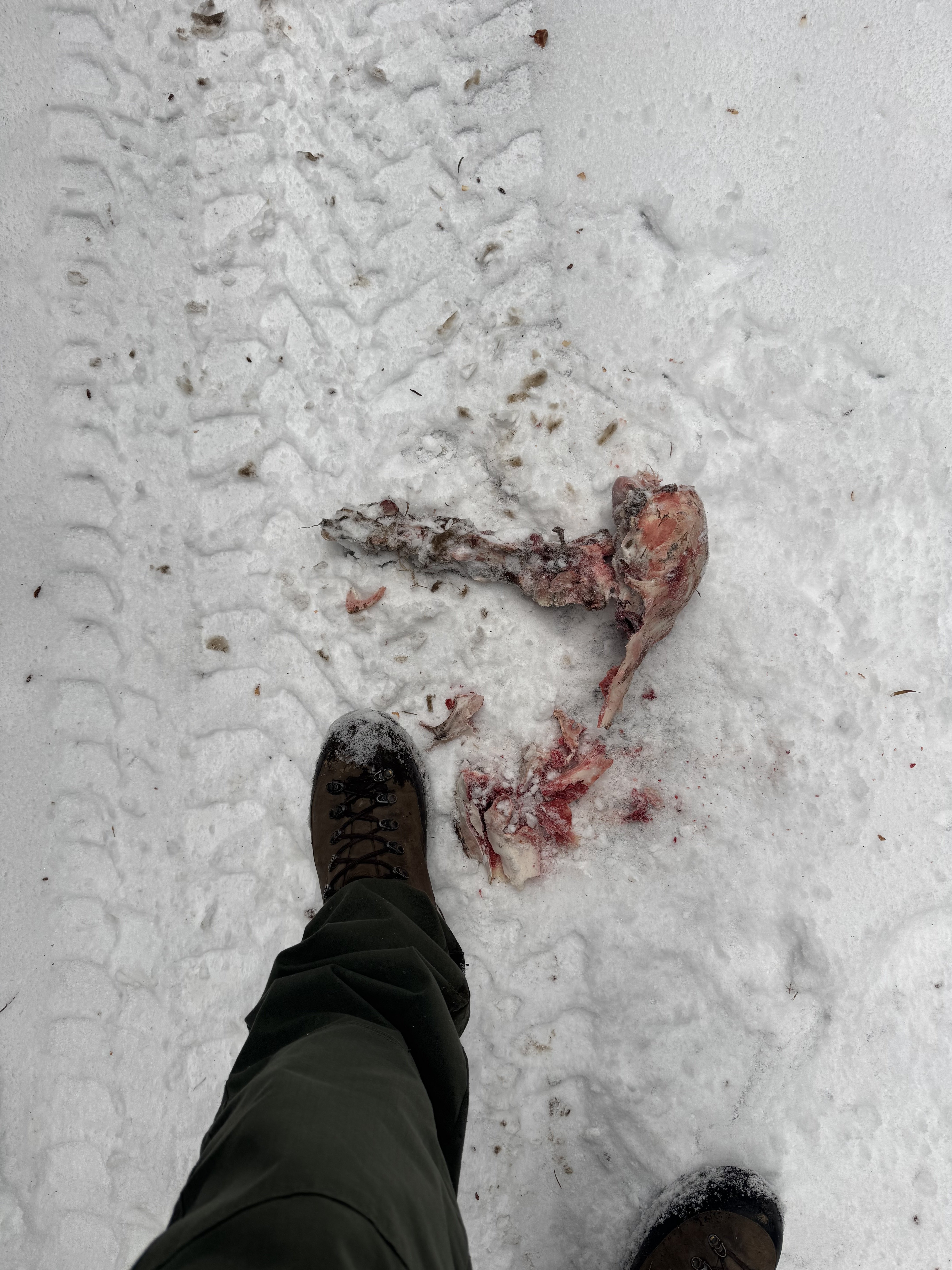 Wolf hunt today in north Idaho. Not much of a winter thus far. We have actually lost snow pack with the Atmospheric River that has flooded much of the PacNW. Saw one Moose today. Saw a-lot of Moose tracks. I went up a dead end road and on the way out discovered I had ran over a kill. Must have been covered in a thin crust of snow. I am guessing its a yearling Moose calf? Maybe a Deer or even a Elk calf. Something had been crunching on the bones and after inspection I found a short black hair on one of the bones. So I kept it and its in the freezer. I am not saying its anything Bigfoot related. But Moose calves, Elk and Deer tend to be a brown color. I thought it was worthy of collecting. If Bigfoot eats ungulates? Surely some evidence will be found on a kill site. If anyone wants the sample? Let me know. In other news I ate it on ice today. The Winchester model 70 hit the ground. Gonna have to check zero. My elbows feel like hamburger. This big thaw has made everything in the mountains a polished sheet of ice. I stepped off the bank after glassing a clear cut and thought the road was snowy. About a 1/4 inch was and underneath was polished glass. Must have looked like a baby Moose on roller skates. Ouch.