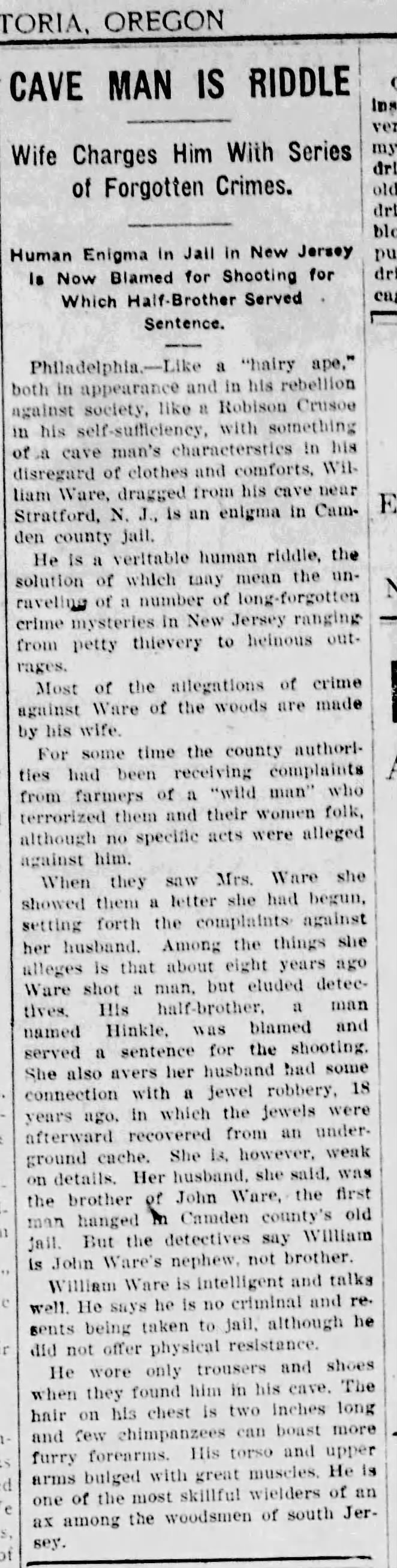 2. From The Morning Astorian of Astoria (OR), a story published on January 2, 1923 of a hairy wild man with bulging muscles in the south Jersey woods. It was a human, but that likely won't prevent it from showing up as a Bigfoot encounter in some books.