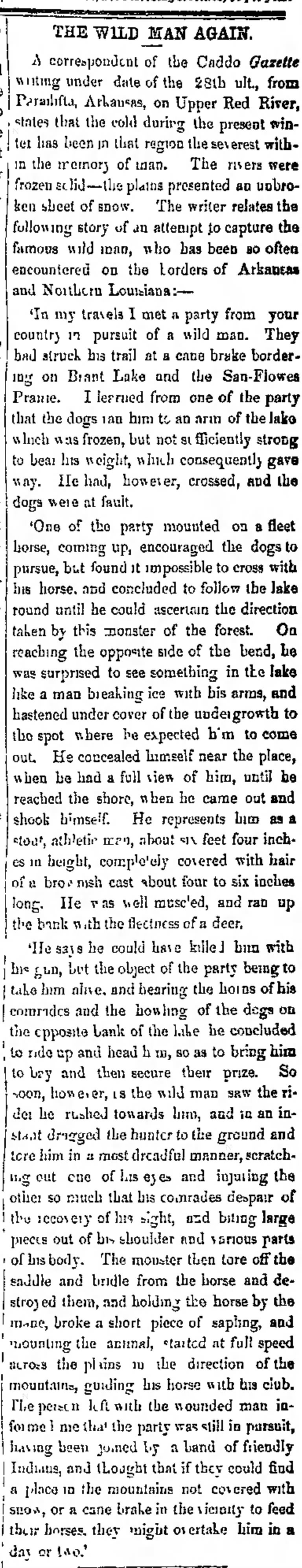 Trogluddite Posted September 26 Posted September 26 (edited) Admittedly, identification of this as a South Dakota encounter is tenuous INCORRECT. The story mentions Brant Lake and Sunflower Prairie as known locations. New York has a Brant Lake, but its in the Adirondacks, without any prairies. There is also a Brant Lake in southeast South Dakota, and while the terrain nearby is now farmed, it probably was largely prairie in the 1850s. The story was published in the Jackson (CA) Amador Ledger on June 14, 1856. UPDATE: In reviewing the archived thread, readers and Tirademan believed that this encounter occurred in Arkansas; this second story calls it the "Arkansas wild man" and states that its also been seen in Louisiana. Further, the correspondent relating the story is from the Upper Red River area; this clearly is not in South Dakota. The added article from the Hornellsville (NY) Weekly Tribune on May 08, 1856 is, I believe, the specific article found by Tirademan. Edited October 12 by Trogluddite To add attribution and clarification.